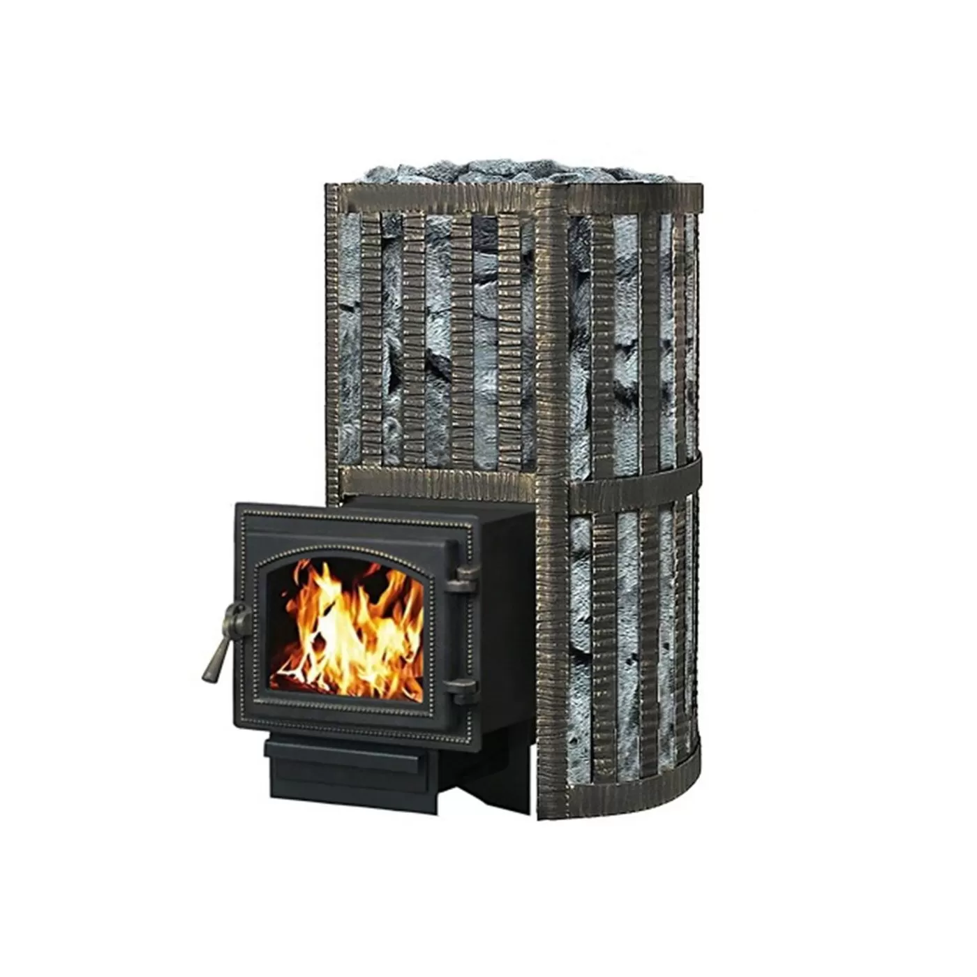 Банная чугунная печь Ураган Ковка 12 (260) укомплектована чугунной герметичной дверцей Везувий 260. Закрытая каменка изготовлена из стали. Конвекционно-вентилируемый кожух 'Ковка' изготовлен из металлической текстурированной полосы покрашенной термостойкой краской и покрытая патиной «Бронза».